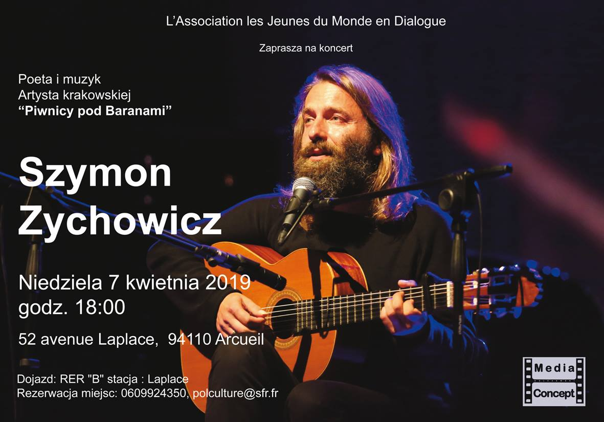 [image: image.png] 7 kwietnia koncert w Arcueil SZYMONA ZYCHOWICZA Poety i muzyka wykonującego piosenkę literacką. Artysty krakowskiej „Piwnicy pod Baranami” oraz kabaretu „Zielone szkiełko”. Serdecznie zapraszamy!