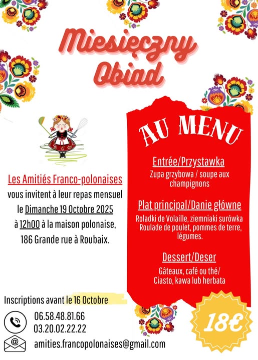 Kolejny miesięczny obiad w Domu Polskim w Roubaix był okazją do wspólnego spotkania i powrotu do polskich korzeni dzięki zaangażowaniu stowarzyszenia Les Amitiés Franco‑Polonaises. Goście mogli delektować się tradycyjnym, domowym posiłkiem, który spotkał się z bardzo ciepłym przyjęciem i dostarczył wielu kulinarnych wrażeń.