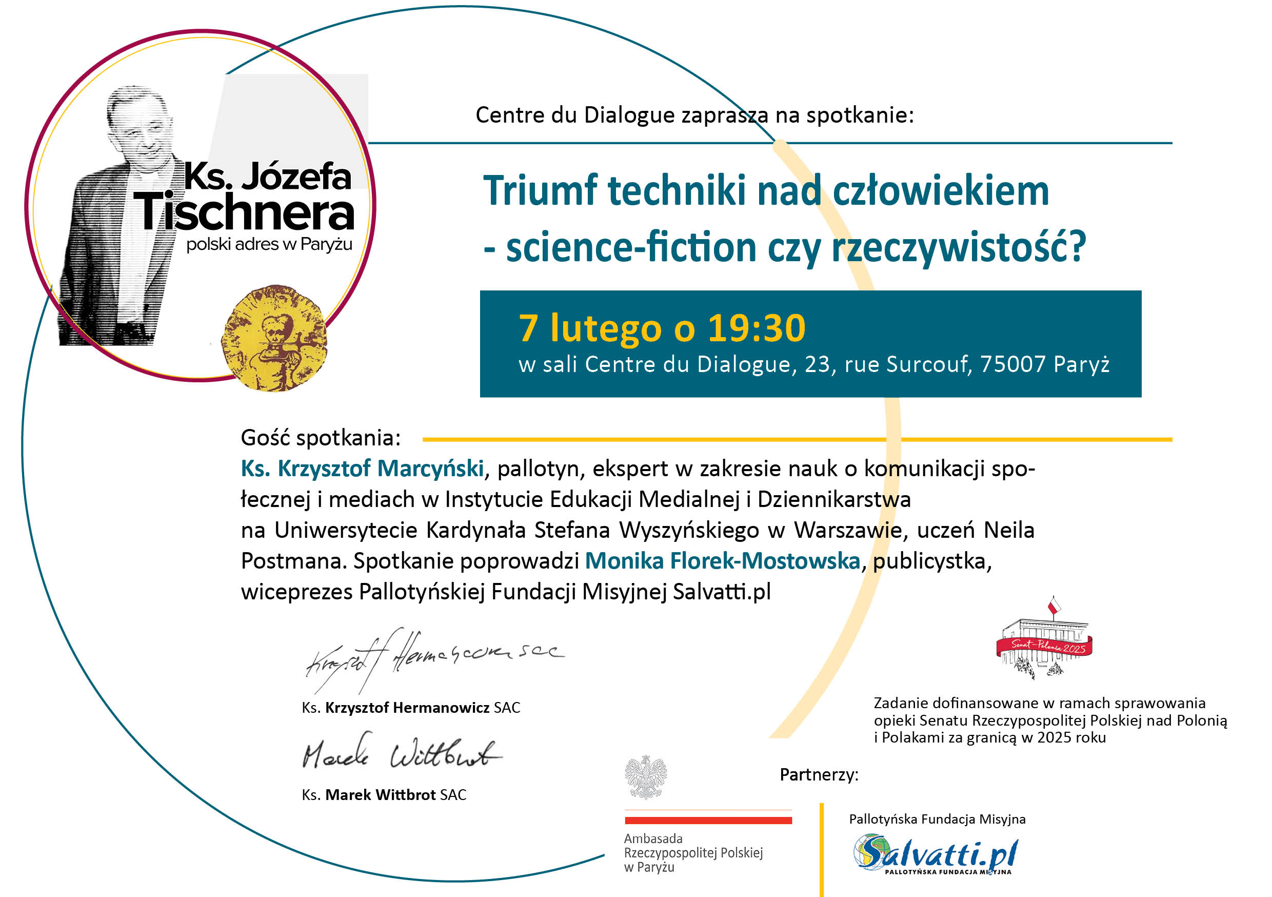 Centrum Dialogu Księży Pallotynów w Paryżu zaprasza na spotkanie z Tomaszem Stawiszyńskim – publicystą, filozofem i autorem głośnych książek, m.in. najnowszego tomu „Powrót fatum”. Rozmowę poprowadzi Monika Florek‑Mostowska (Fundacja Salvatti.pl). Wydarzenie odbędzie się w siedzibie Centre du Dialogue przy rue Surcouf (7. dzielnica).