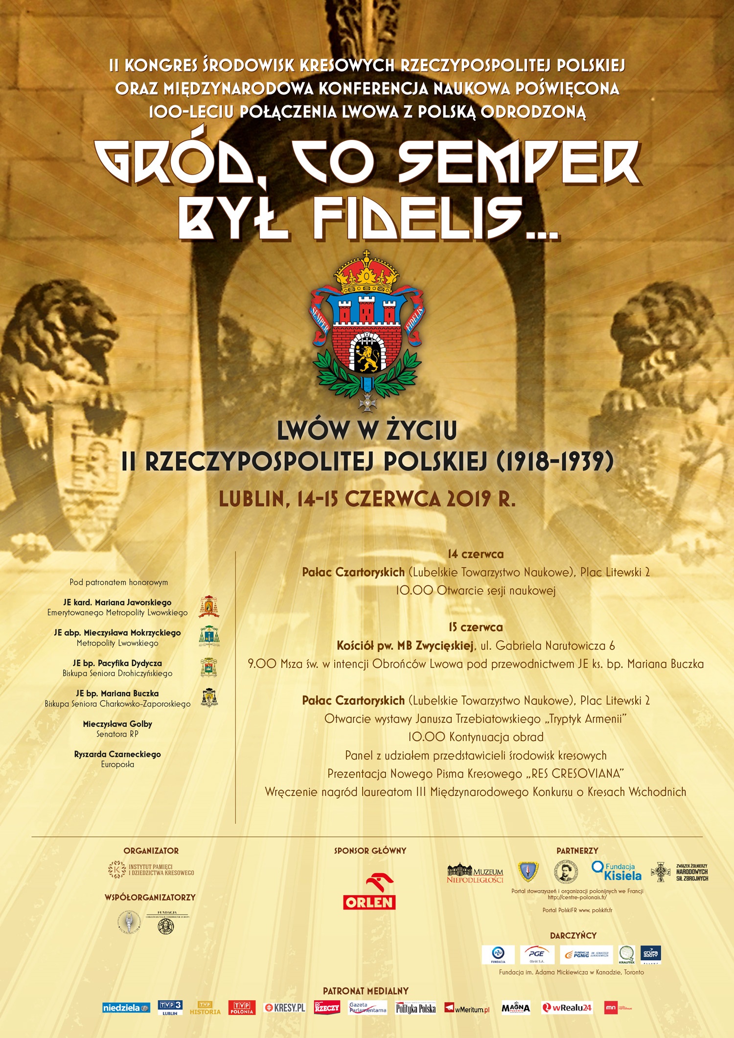 Już za kilka dni w Lublinie odbędzie II Kongres Środowisk Kresowych Rzeczypospolitej Polskiej oraz Międzynarodowa Konferencja Naukowa „Gród, co Semper był Fidelis…Lwów w życiu II Rzeczypospolitej Polskiej (1918-1939)” poświęcona 100-leciu połączenia Lwowa z Polską odrodzoną. Obydwa wydarzenia odbędą się 14-15 czerwca w siedzibie Lubelskiego Towarzystwa Naukowego (Plac Litewski 2). Początek o godz. 10. Głównym
