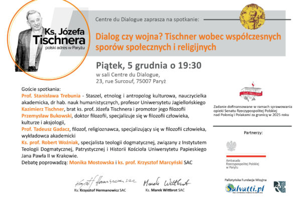 5 grudnia 2025 roku o godz. 19:30 w Centrum Dialogu Księży Pallotynów przy rue Surcouf w Paryżu odbyła się Debata Tischnerowska zatytułowana „Dialog czy wojna? Tischner wobec współczesnych sporów społecznych…