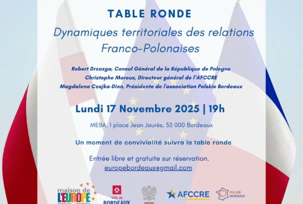 Miejsce: Maison de l’Europe Bordeaux‑Aquitaine (MEBA), 1 place Jean‑Jaurès, Bordeaux Organizacja: MEBA, we współpracy m.in. z Polskie Bordeaux, AFCCRE oraz Miastem Bordeaux Data i godzina: poniedziałek, 17 listopada 2025 r.,…
